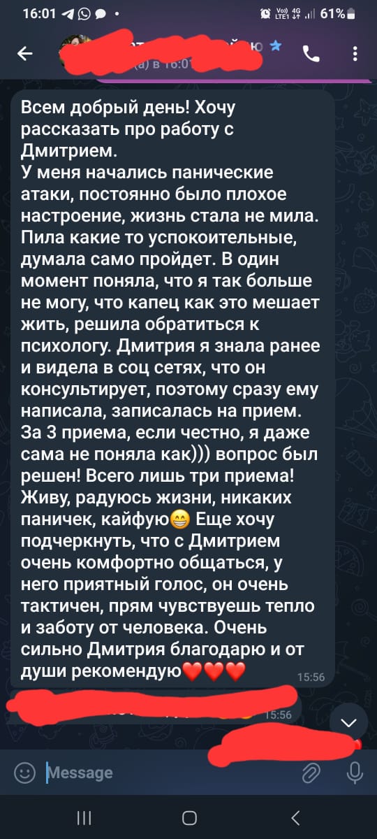 Благодарю за работу🙏 в пиковой ситуации удалось снять напряжение, болезненность. Дмитрий чуткий, открытый работать легко♥ работа с мужчиной психологом интересна, при запросе кризис в паре.